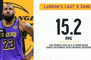 打法变了也确实老了!詹姆斯近5场场均15.2分 新秀赛季以来最低