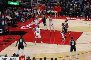 生猛!格兰特冲下前场板 腾空暴起力压巴恩斯单臂隔扣