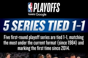 据统计,这是联盟自1984年开始实行目前季后赛的赛制以来,首轮出现1-1的对决并列最多的一年季后赛,同时也是自2014年以来的首次。
