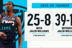 缺席后胜率更高?本赛季杰伦威在场雷霆25胜8负 缺席期间39胜10负