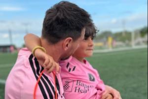 梅西穿着迈阿密训练服,小儿子穿着迈阿密国际球衣。