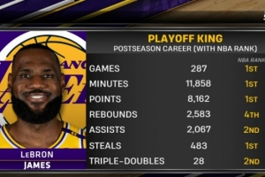 詹姆斯的季后赛出战场次、出场时间、总得分、总抢断都是历史第一,总助攻、三双次数历史第二,总篮板数历史第四。