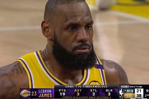 系列赛首战,湖人球星詹姆斯拿到19分3助攻2抢断3盖帽,其中3次助攻是他个人自2014年总决赛以来个人季后赛最低。