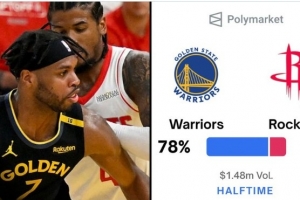 数据媒体Polymarket Sports更新了本轮系列赛晋级胜率,其中勇士高达78%,火箭仅为22%。