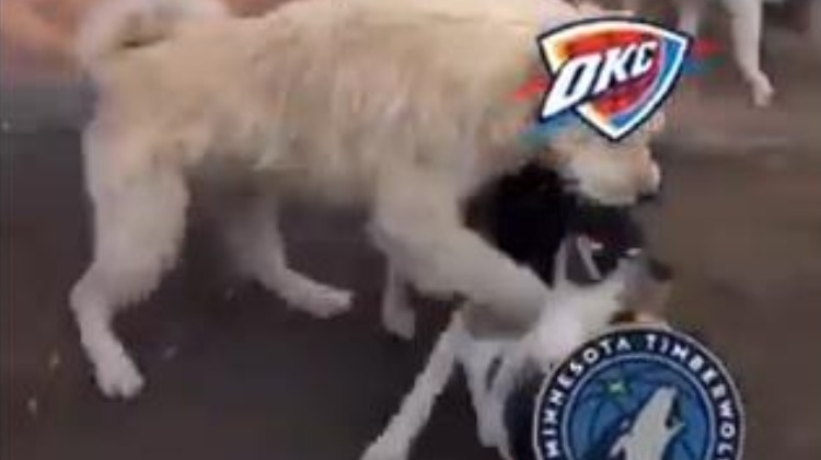 视频中有狗狗闹事,狗王“长毛”(雷霆)缓缓走来,大黑狗(灰熊)被吓了缩起身体低头,躺着的狗(掘金)嗷着起身立正,闹事狗(森林狼)被它轻轻摁倒在地。