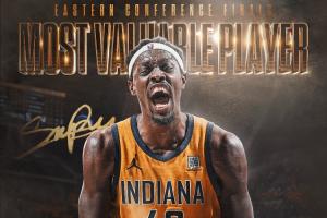 直播吧06月01日讯 步行者4-2淘汰尼克斯,与雷霆会师总决赛,西亚卡姆险胜哈利伯顿当选MVP。