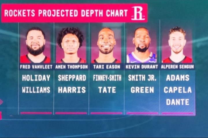 直播吧07月12日讯 今日夏联对阵快船,火箭总经理斯通在现场接受采访时,转播方晒出的火箭阵容深度图: