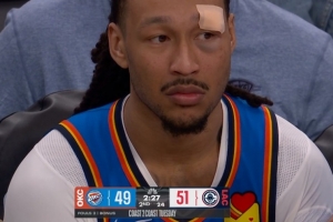 挺有喜感!杰林威首节眼部出血&回更衣室处理 目前已包扎好
