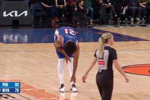 那边造不了犯规!恩比德上篮倒出场外小崴一下 摄影师躲都没躲开