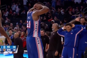 76人在麦迪逊广场花园击败尼克斯 恩比德跳舞庆祝&洛瑞和庄神模仿