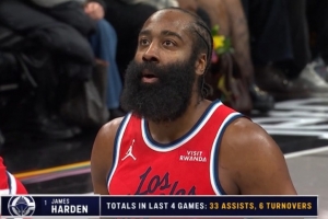 稳健控场!哈登过去4场送出33助攻有6失误 助失比5.5:1