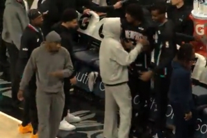 这是……!莫兰特身穿帽衫在替补席与一众队友握手撞胸以示支持