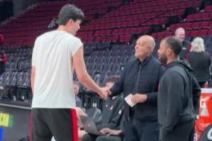 小吧现场直击:杨瀚森与助教轻松交流 手臂上的抓伤依旧清晰可见