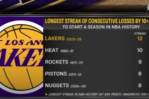 😮湖人开赛季以后12场失利均输两位数 已经是NBA历史纪录!