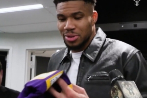 字母哥赛后在采访时展示詹姆斯送给他的签名球衣:这对我意义重大