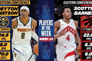 直播吧1月13日讯 今日NBA官方宣布,掘金队的沃特森和猛龙球星巴恩斯分获西部和东部周最佳球员。