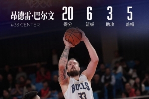 香港金牛战胜湖北文旅斩获八连胜,此役全队五人得分上双。巴尔文在展示强大护框能力的同时,砍下全队最高的20分并贡献6篮板3助攻。