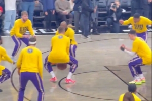 谁想出来的😂老詹引领球队魔性开场 将球扔向天空集体下蹲