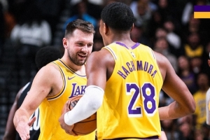 赛后,湖人官方晒出本场赢球海报,东契奇和八村塁登上封面。