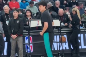 小吧现场直击杨瀚森赛前热身:跑跑跳跳很放松 底角三分手感不佳