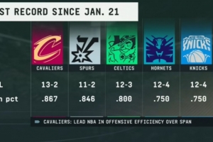 1月21日以来最佳战绩:骑士居首 马刺居次 绿军黄蜂尼克斯分列3-5