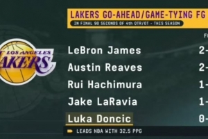 湖人最后90秒出手扳平或反超球:詹姆斯5中2小里2中2 东契奇0出手