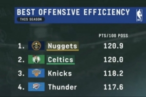 本赛季每百回合进攻效率榜:掘金第1 绿军第2 尼克斯第3 雷霆第4