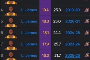 詹姆斯本赛季至今场均16.3次出手&21.7分 均为湖人生涯最低!