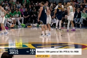 如日中天!约基奇赛季15次拿到30+得分&10+篮板 领跑全联盟