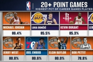 历史20+场数占比:乔丹86.4%第1 东契奇2KD3詹姆斯4恩比德6锡安9