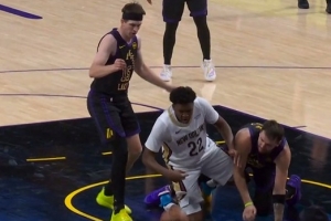 卖力!东契奇积极回防干扰奎因上篮 倒地拼抢还为湖人赢得球权