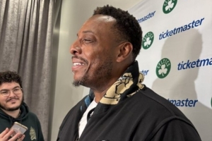 直播吧3月23日讯 今天,凯尔特人名宿皮尔斯回到球队主场参加活动。