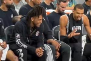 😂嘛呢班子?文班昨日替补席和卡斯尔玩闹 搞怪模仿小狗吐舌