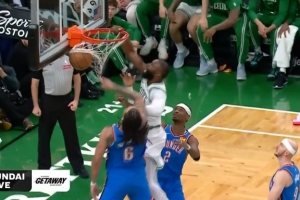 这身体这弹速!杰伦·布朗转身一步垫起 单臂隔扣杰林威!