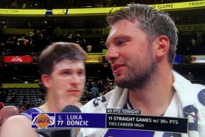 直播吧3月26日讯 NBA常规赛,湖人客场137-130战胜步行者。赛后东契奇接受了采访。