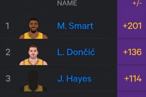 湖人球员2026年至今正负值:斯玛特+201领跑 东契奇第2 詹姆斯第5