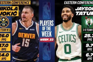 直播吧3月31日讯 今天,NBA官方公布了25-26赛季第23周东西部周最佳球员,塔图姆和约基奇当选。