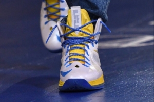 直播吧4月10日讯 勇士主场迎战湖人,库里今天穿着詹姆斯经典战靴LeBron 10入场。