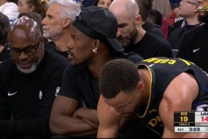 久违了!吉米·巴特勒自受伤后首次出现在球队替补席 便装观战