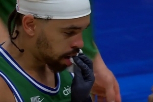 看着都疼!河村勇辉防守击中瑞安·内姆哈德 导致后者嘴部出血