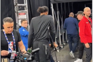 摩西·穆迪拄拐现身快船主场观战 赛前和球迷打招呼