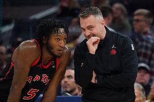 谈及奎克利的情况,拉贾科维奇表示:“情况和昨日一致。全队今天只进行了轻量调整,观看了战术录像、完成了一些投篮训练,整体训练强度不大。”