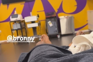 詹姆斯晒出他和儿子布朗尼都早早(洛杉矶时间早上8点40点左右)来到湖人训练馆的训练室接受理疗并准备参加训练的自拍画面,并写道:“早起的鸟儿🐦有虫🪱吃!@布朗尼”