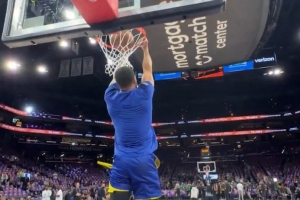 轻松写意!库里赛前自抛自接 完成了一个空接背扣