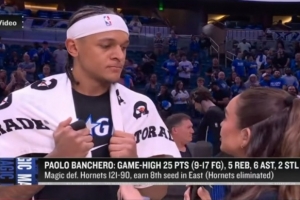 直播吧4月18日讯 NBA附加赛,魔术121-90战胜黄蜂。本场比赛,班凯罗全场出战33分钟,17投9中,三分6投2中,罚球8罚5中,得到25分5篮板6助攻2抢断1盖帽2失误。他在场边接受了采访,以下为采访全文。