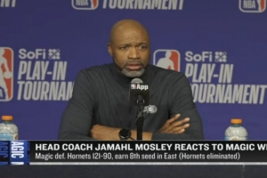 直播吧4月18日讯 NBA附加赛,魔术121-90战胜黄蜂。赛后,魔术主教练莫斯利接受了采访,以下为全文。