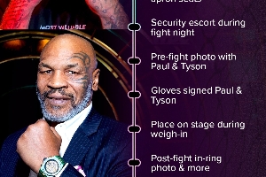 这场比赛的VIP套票包含了一系列福利,包括距离拳台边最近的两个座位,观众席第一排和第二排的各四个座位,还可以在更衣室与泰森合影,获得两名拳手的签名手套,还将在泰森下榻的酒店获得两晚的住宿,另外赛事主办方还会为VIP套票持有者提供安保、专车接送等一系列服务。