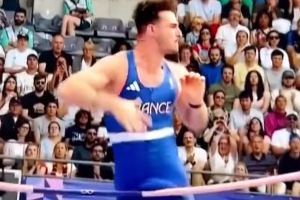 安东尼-阿米拉蒂前两跳均挑战失败,最后一跳时身体已越过横杆,但因隐私部位碰到横杆导致横杆跌落,挑战失败。