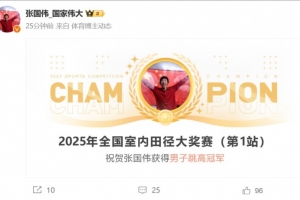 直播吧2月10日讯 2025年全国室内田径大奖赛成都站男子跳高项目,张国伟夺得冠军。