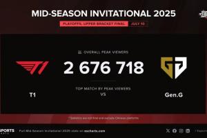 直播吧7月10日讯 外网数据统计媒体Esports Charts分享了T1对战GEN海外峰值,具体如下:2025 MSI胜者组淘汰赛T1对战GEN海外峰值来到267万,为历史上T1对战GEN第二高峰值,同时也位列本次MSI比赛第一。